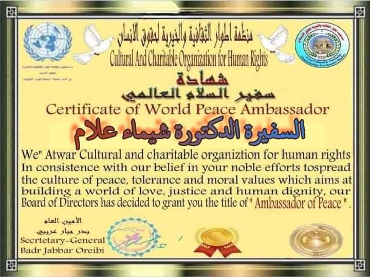 منح الأعلامية شيماء علام شهادة شرفية مشتركة من الأكاديمية الدولية للسلام والتمنية البشرية المستدامة و المنظمة الدولية لمتطوعي الأمم المتحدة واختيار منظمة اطوار الحقوقية لها سفيرة دولية للسلام.