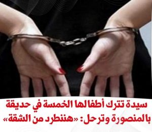 تمكن الأهالى من ضبط سيدة بعد تركها 5 أطفال بينهم رضيعان، فى حديقة عامة بشارع الجيش بمدينة المنصورة.