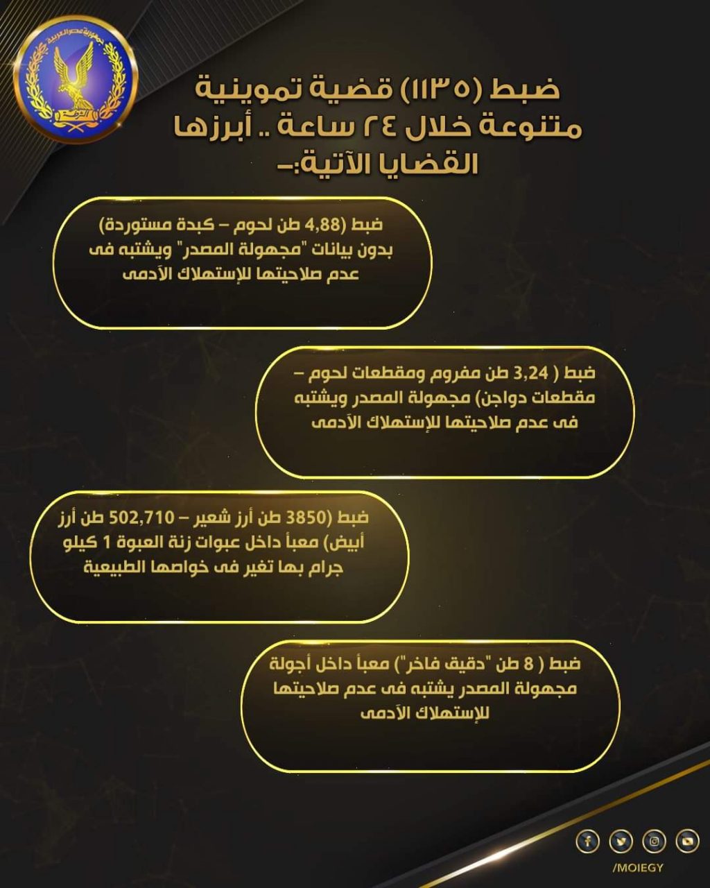 ضبط (المدير المسئول عن مخزن لتجارة السلع الغذائية) بمحافظة الدقهلية وبحوزته (6,6 طن “سكر – أرز” – 120 عبوة “زيت تموينى”) مُخصص ربطاً على البطاقات التموينية قام بتجميعها للإتجار بها فى السوق السوداء بأزيد من السعر الرسمى وتحقيق أرباح بطرق غير مشروعة قدرت بــ (75800 جنيهاً).