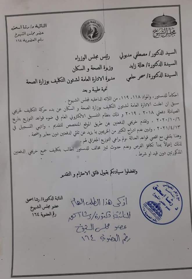 يأتي هذا استجابةً لطلبات السادة أعضاء مجلس النواب حزب حماة الوطن، والنقابات الفرعية، والصيادلة خريجي دفعتي 2018 ، 2019