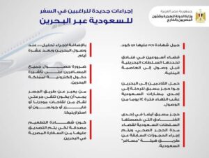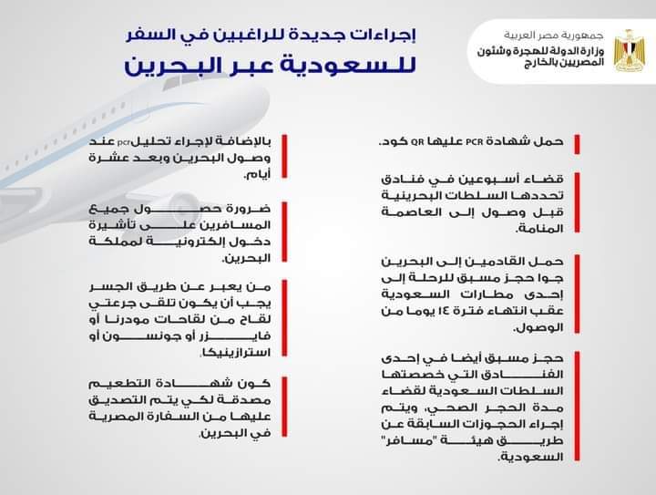 تحيط وزارة الدولة للهجرة وشؤون المصريين بالخارج، المصريين الراغبين السفر للملكة العربية السعودية عبر مملكة البحرين خلال هذه الفترة، علمًا بأن السلطات البحرينية أصدرت قرارات جديدة بشأن المرور من خلالها للسعودية.