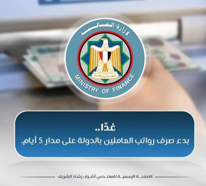 وزارة_المالية تبدأ غدًا الثلاثاء، صرف رواتب العاملين بالدولة على مدار 5 أيام.