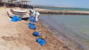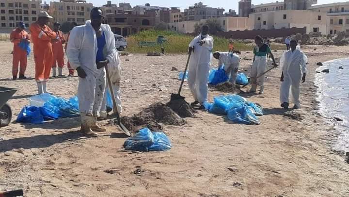 إستمرار عمليات إحتواء التلوث الزيتى بالشاطئ ومسح بحرى للمنطقة والتأكد من خلوها من أى آثار للتلوث