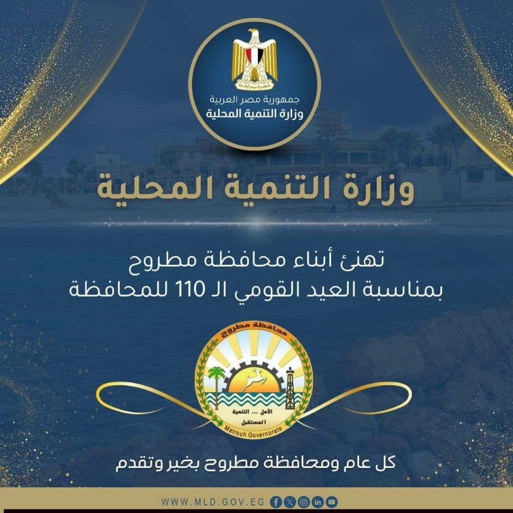 بخالص التهنئة إلى اللواء خالد شعيب، محافظ مطروح، وإلى أبناء المحافظة الكرام، بمناسبة الاحتفال بالعيد القومي الـ110 لمحافظة مطروح، والذي يوافق 15 ديسمبر من كل عام.