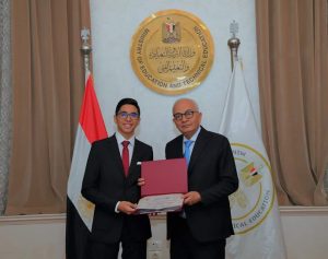وهنأ الوزير كلا من الطالب (زياد سامح محمد النجار) الحاصل على المركز الأول علي العالم في المستوى الرفيع فى مادة الرياضيات