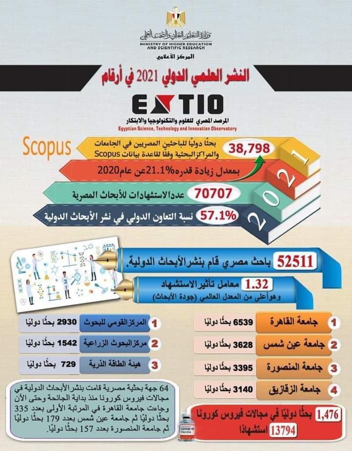 وما شهدته الجامعات والمراكز البحثية المصرية من نمو ملحوظ في النشر العلمي الدولي لعام 2021