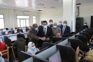 كما تفقد الوزير لجان الامتحانات بكلية التمريض بالجامعة، وأشاد بالتطبيق الحازم للاجراءات الاحترازية في لجان الامتحانات