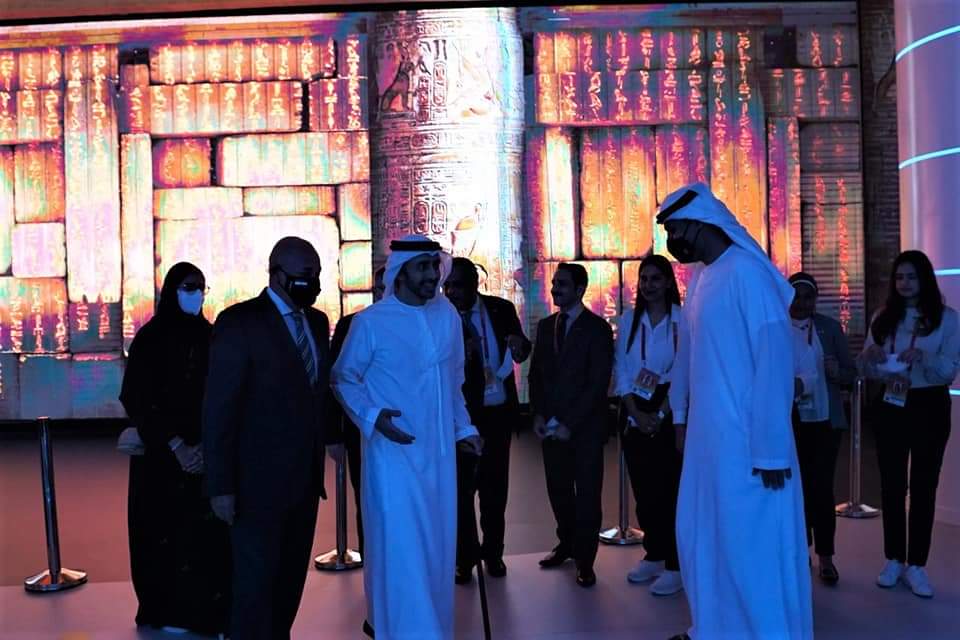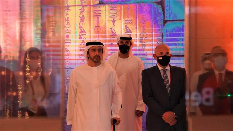 قام سمو الشيخ عبدالله بن زايد وزير الخارجية والتعاون الدولي بدولة الامارات العربية المتحدة بزيارة للجناح المصري باكسبو 2020 دبي، حيث تفقد كافة المعروضات ومحتويات الجناح والتي تضمنت التابوت الفرعوني والمستنسخات الاثرية والشاشات التفاعلية حيث كان في استقباله السيد/ شريف البديوى السفير المصري بدولة الامارات العربية المتحدة والسفير/ اشرف الديب القنصل العام لمصر بدبي والوزير مفوض تجاري أشرف حمدي، رئيس المكتب التجاري المصري بدبي ونائب المفوض العام للمشاركة المصرية باكسبو 2020 دبي