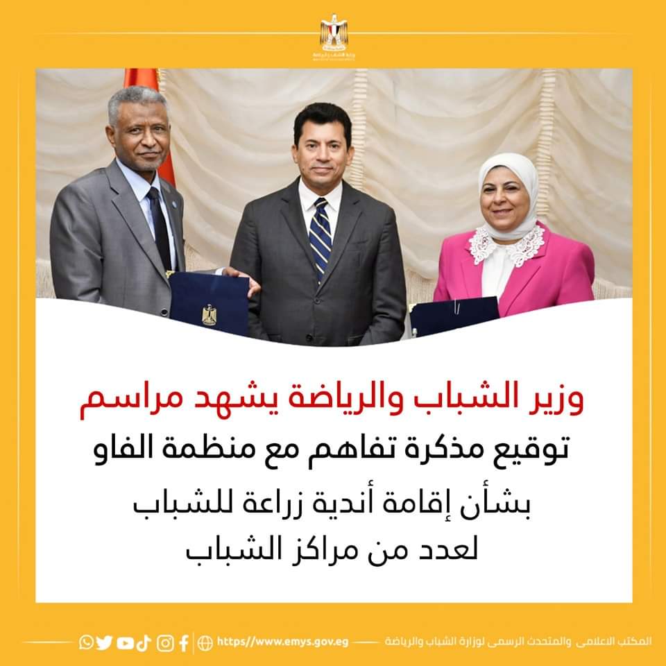 وزير الشباب والرياضة يشهد مراسم توقيع مذكرة تفاهم مع منظمة الفاو بشأن إقامة أندية زراعة للشباب لعدد من مراكز الشباب