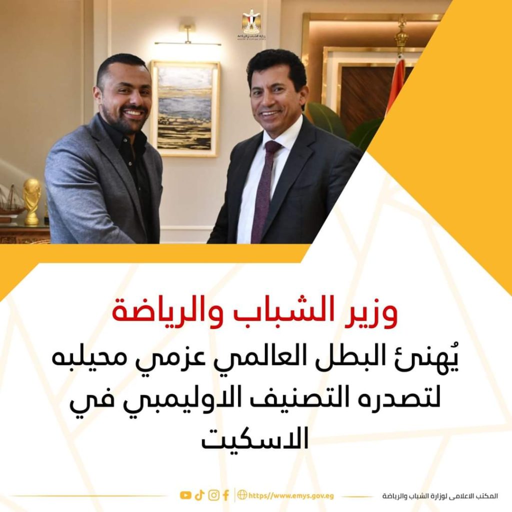 وأعرب وزير الشباب والرياضة عن بالغ سعادته بهذا الانجاز الكبير لنجم المنتخب المصري للرماية عزمي محيلبة