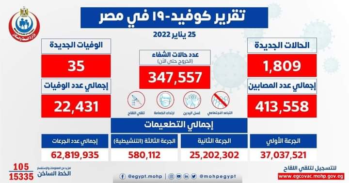 وأوضح الدكتور حسام عبد الغفار المتحدث الرسمي لوزارة الصحة والسكان، أنه تم تسجيل 1809 حالة جديدة ثبتت إيجابية تحاليلها للفيروس ومتحوراته، وذلك ضمن إجراءات الترصد والتقصي والفحوصات اللازمة التي تُجريها الوزارة وفقًا لإرشادات منظمة الصحة العالمية، لافتًا إلى وفاة 35 حالة جديدة.