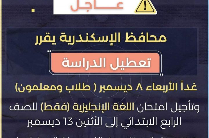 كتبت___ رويدا محمد سليم أعلن اللواء/ محمد الشريف محافظ الإسكندرية تعطيل الدراسة غداً...